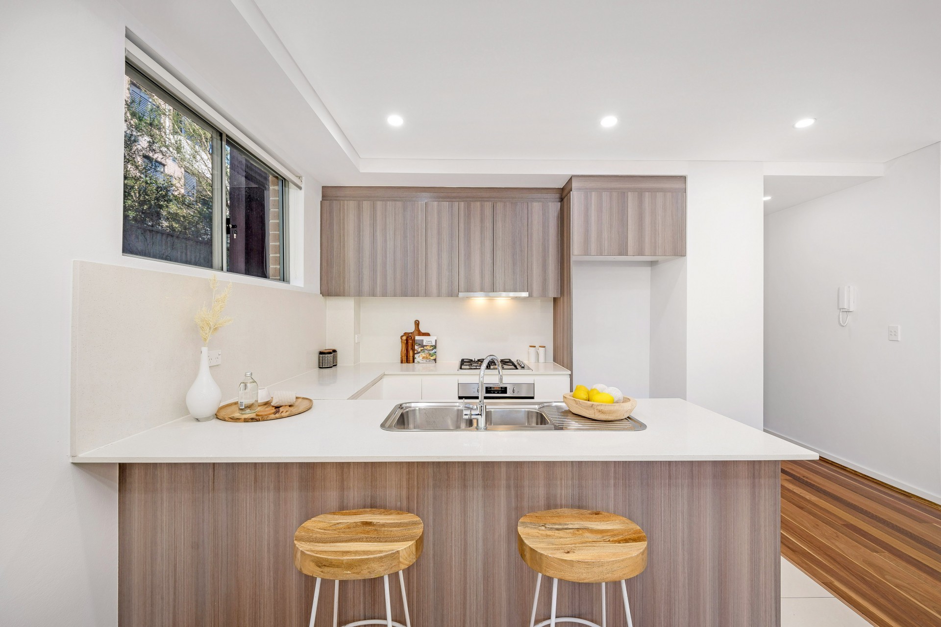 - Hostess kitchen with stone benchtops