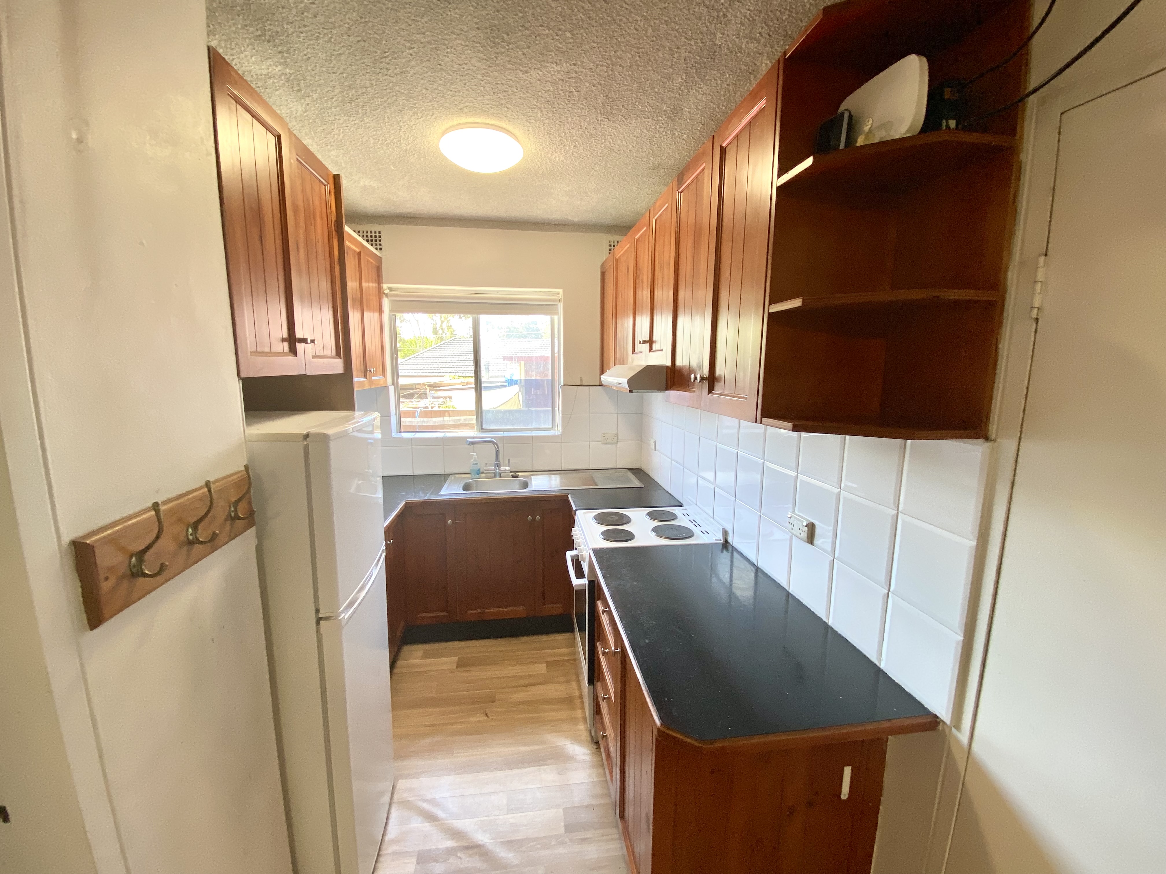 - Updated timber kitchen presents electric stove cooking.