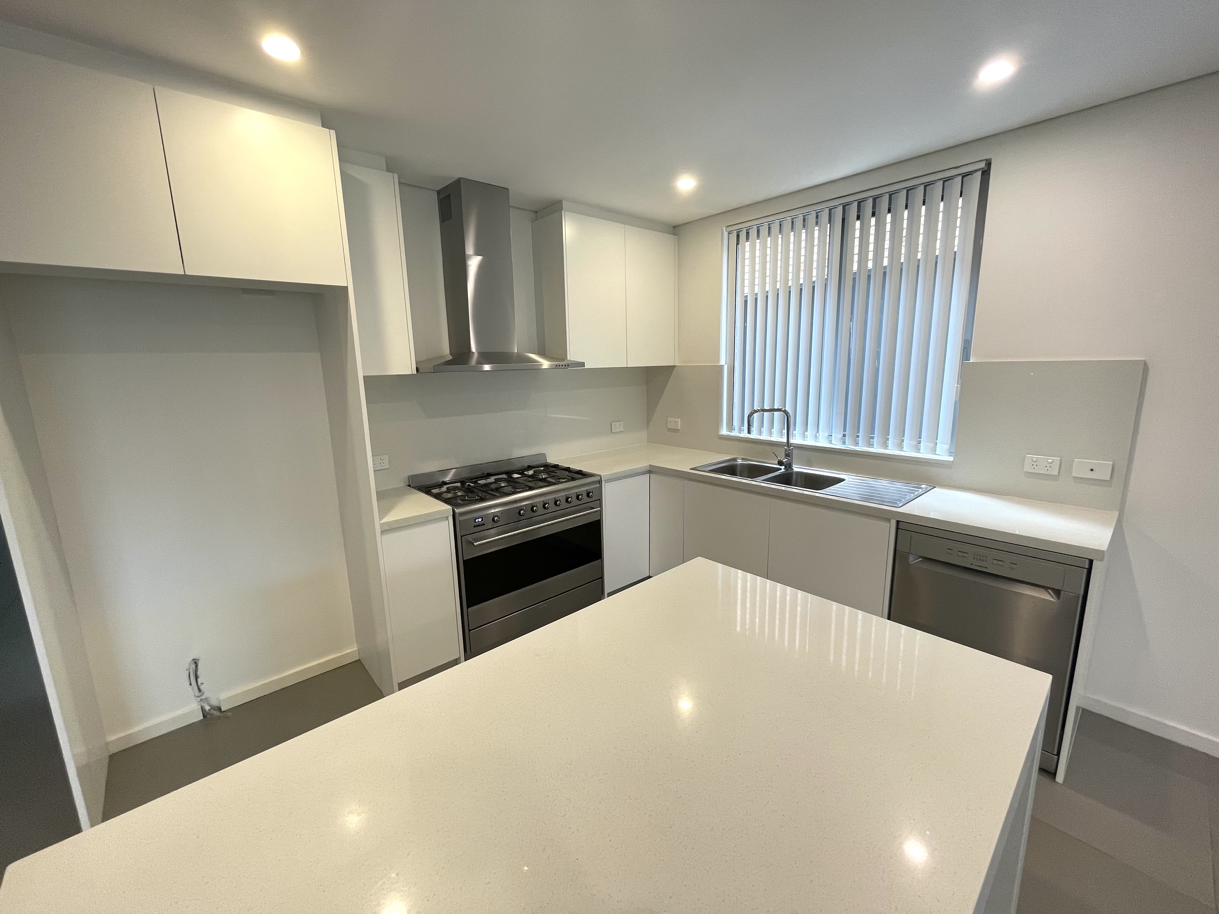 - Designer Island kitchen with caesarstone benchtop, freestanding 6 burner gas oven & ducted range-hood + dishwasher