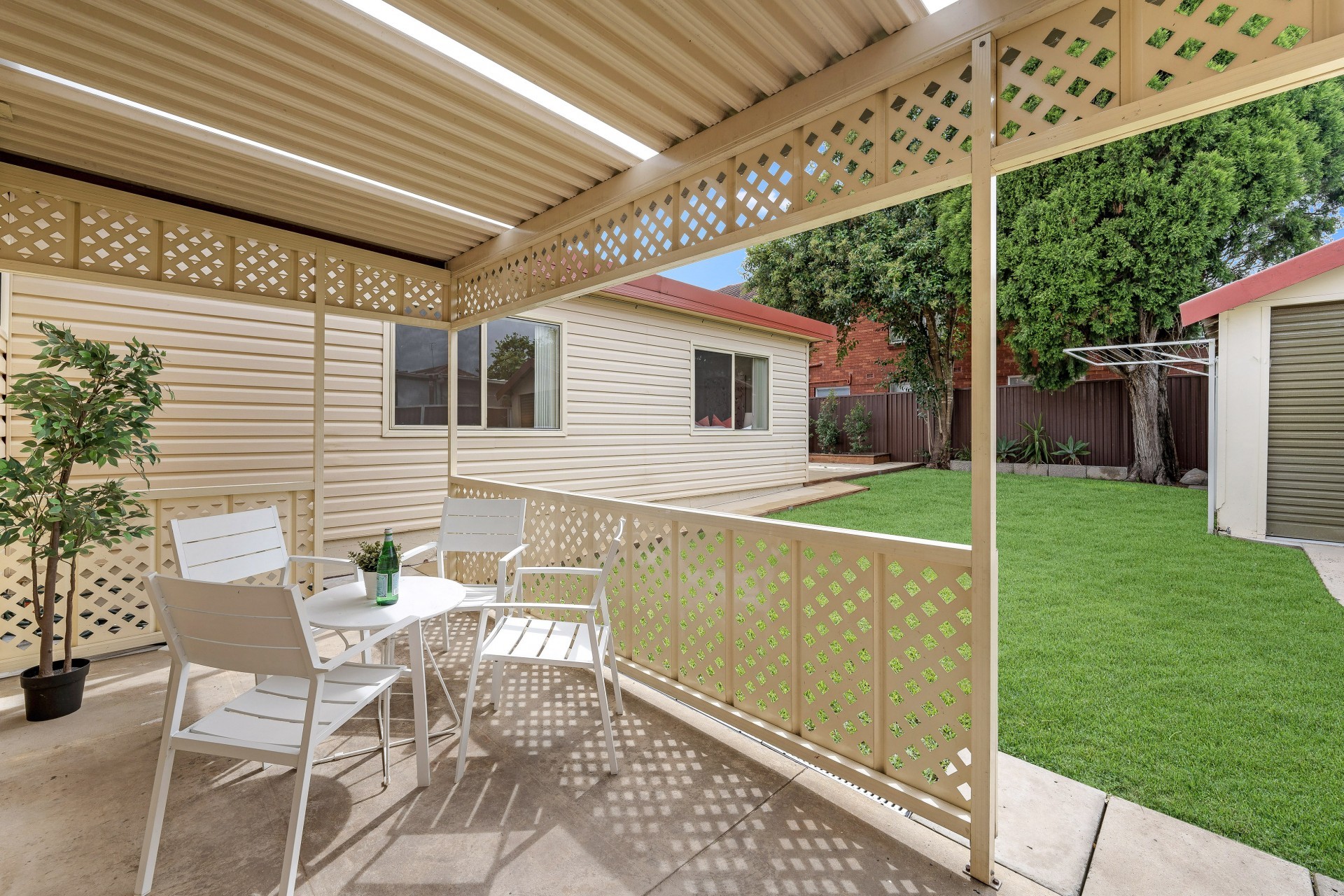 - Private level rear yard with entertaining area and wide drive to lock-up-garage.