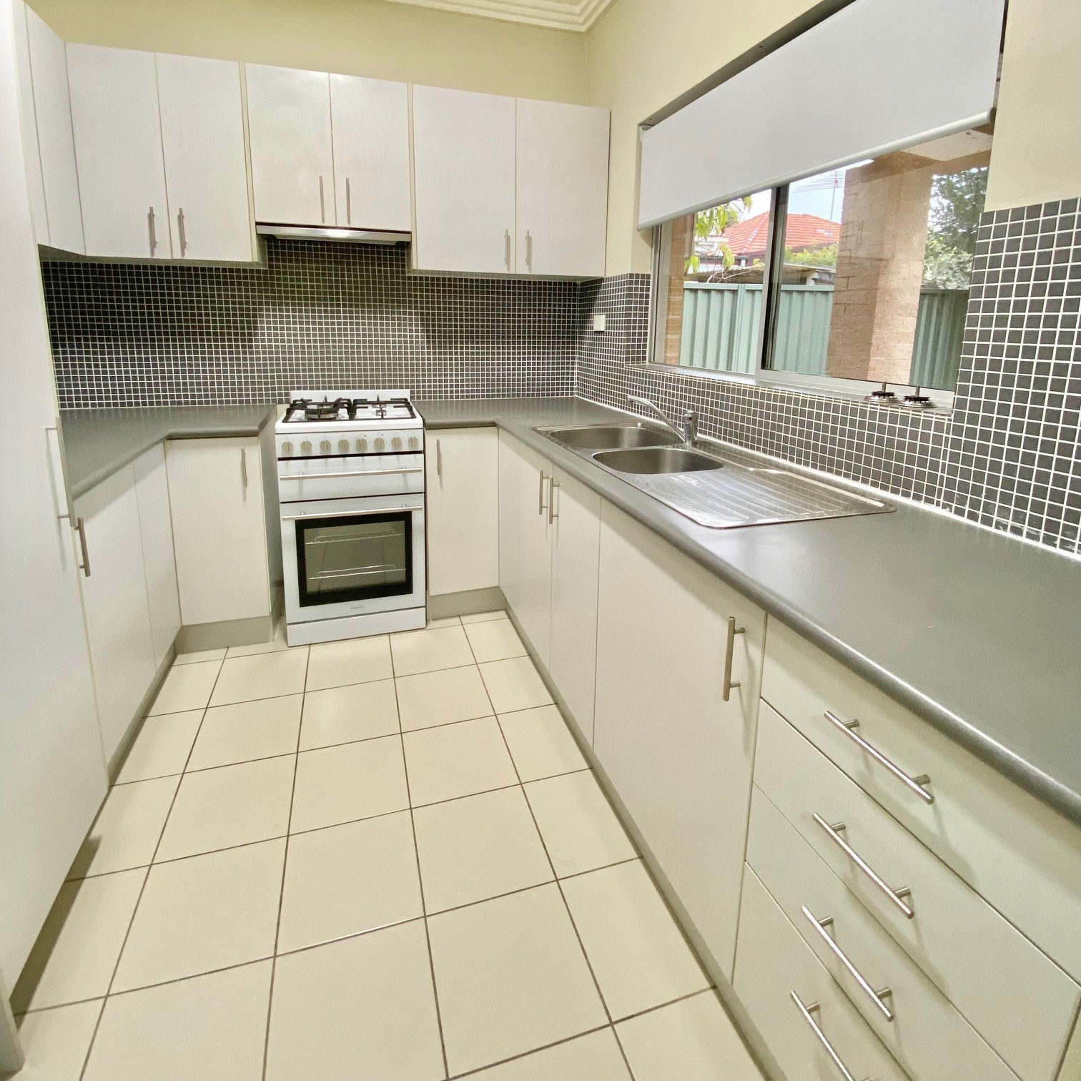 Modern kitchen with lots of natural light and stainless steel gas appliances